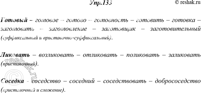 133. По «Школьному словообразовательному словарю» А. Н. Тихонова определите, какие гнёзда (цепочки) слов образованы от исходных слов готовый, ликовать, сосед, из каких значимых частей состоит каждое образованное слово и какой способ словообразования был при этом использован.