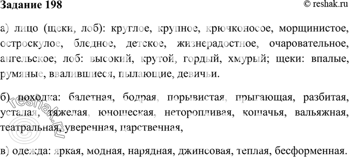 198. Подберите и запишите эпитеты, уместные при описании: а) лица (щёк, лба); б) походки; в) одежды — хорошо знакомого вам человека.