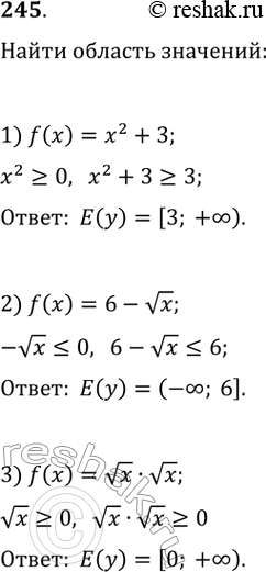 245. Найдите область значений функции: 1) f(x) = х^2 + 3; 2) f(х) = 6 - корень(х); 3) f(х) = корень(х) * корень(х).
