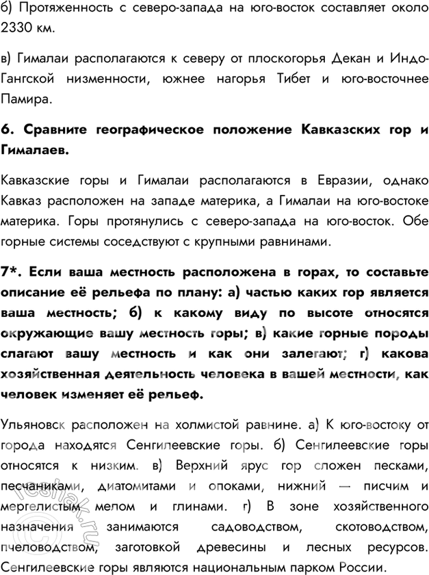 7*. Если ваша местность расположена в горах, то составьте описание её рельефа по плану: а) частью каких гор является ваша местность; б) к какому виду по высоте относятся окружающие вашу местность горы; в) какие горные породы слагают вашу местность и как они залегают; г) какова хозяйственная деятельность человека в вашей местности, как человек изменяет её рельеф.
