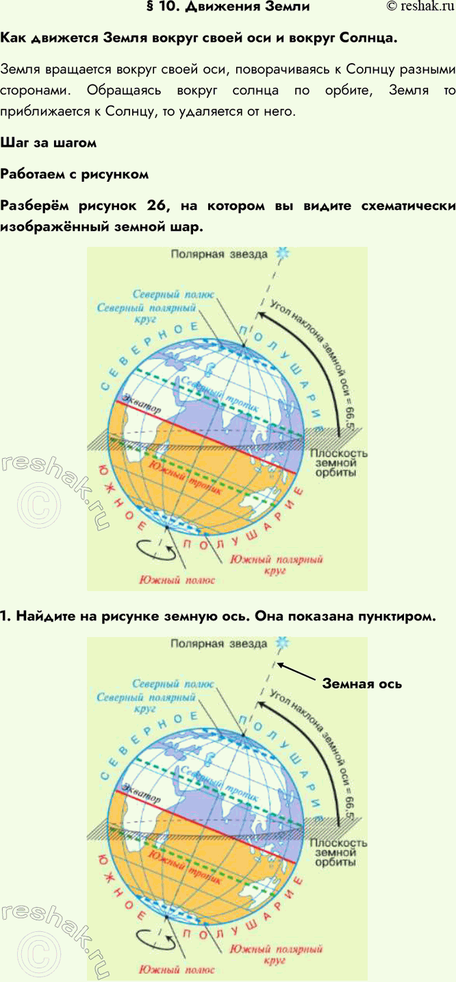 1. Найдите на рисунке земную ось. Она показана пунктиром.