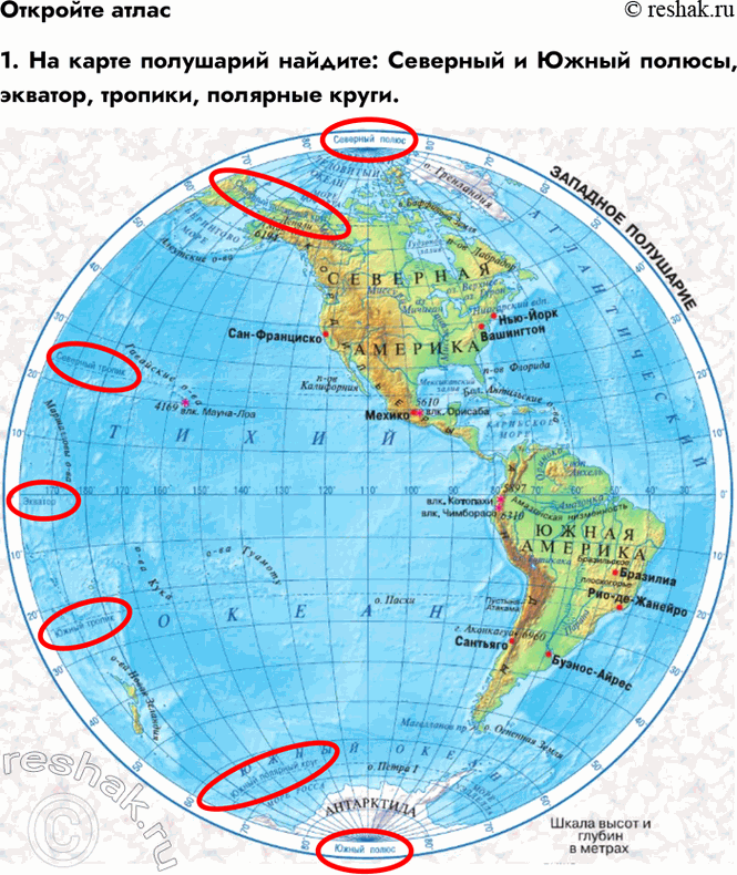 1. На карте полушарий найдите: Северный и Южный полюсы, экватор, тропики, полярные круги.