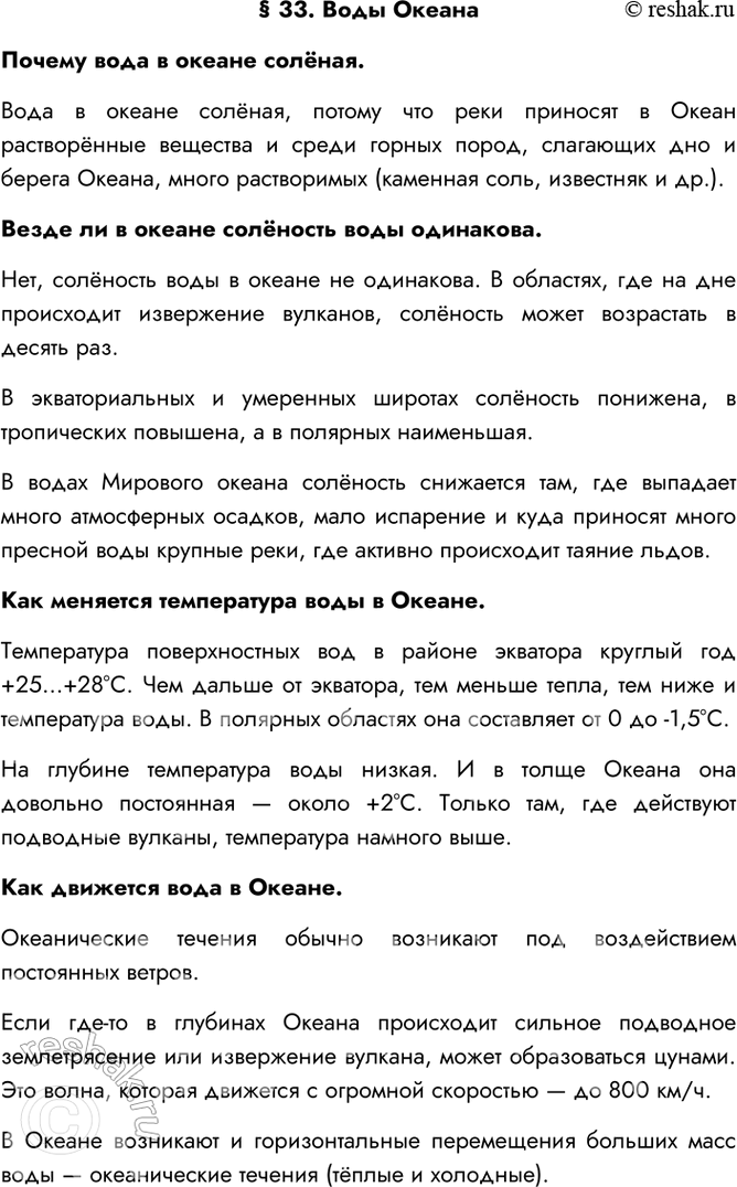 § 33. Воды Океана Почему вода в океане солёная. Вода в океане солёная, потому что реки приносят в Океан растворённые вещества и среди горных пород, слагающих дно и берега Океана, много растворимых (каменная соль, известняк и др.).