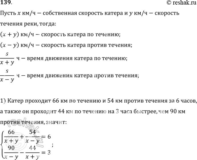 Катер проходит 66 км по течению реки и 54 км против течения за 6 ч. Этот катер проходит 44 км по течению на 3 ч быстрее, чем 90 км против течения.
