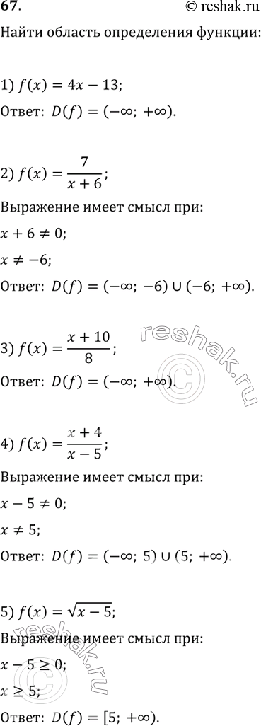 67. Найдите область определения функции: 1) f(x)=4x-13; 2) f(x)=7/(x+6); 3) f(x)=(x+10)/8; 4) f(x)=(x+4)/(x-5); 5) f(x)=v(x-5); 6) f(x)=1/v(4-x); 7) f(x)=9/(x^2-5); 8) f(x)=14/(x^2+4);