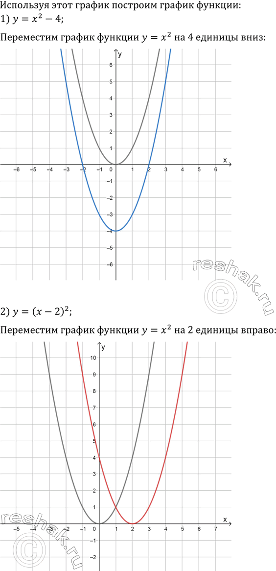 Постройте график функции у = х^2. Используя этот график, постройте график функции: 1) у = х^2 - 4; 2) у = (х- 2)^2;