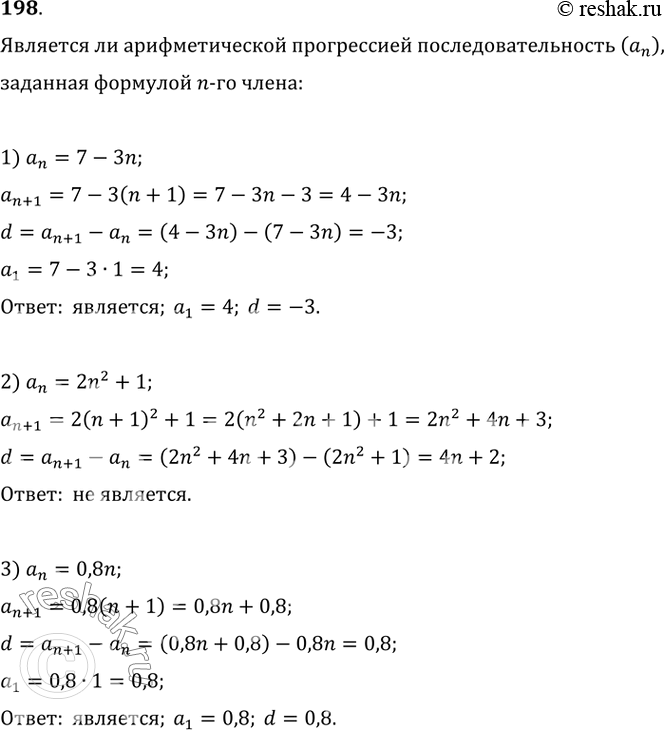 Является ли арифметической прогрессией последовательность (аn), заданная формулой n-го члена: 1) an=7-3n; 2) an=2n^2+1; 3) an=0,8n; 4) an=20,64n+23; 5) an=(n-1)/(n+1); 6) bn?