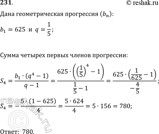 Найдите сумму четырёх первых членов геометрической прогрессии (bn), если b1 = 625, а знаменатель q = 1/5.