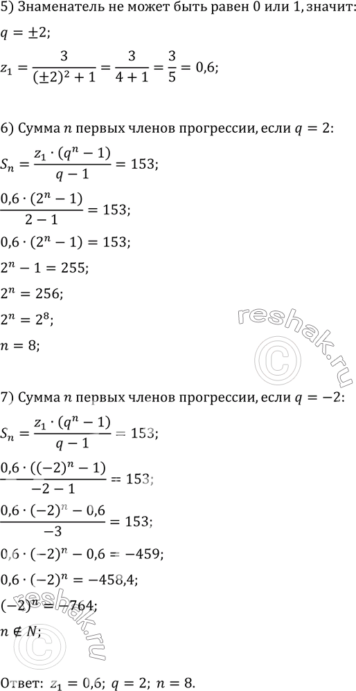 Найдите первый член, знаменатель и количество членов конечной геометрической прогрессии (zn), если z5 - z1 = 9, z3 +z1 =3, а сумма всех членов Sn = 153.