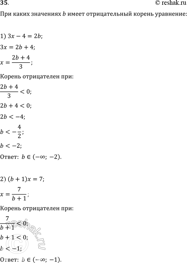 35. При каких значениях b имеет отрицательный корень уравнение: 1) 3x-4=2b; 2) (b+1)x=7;