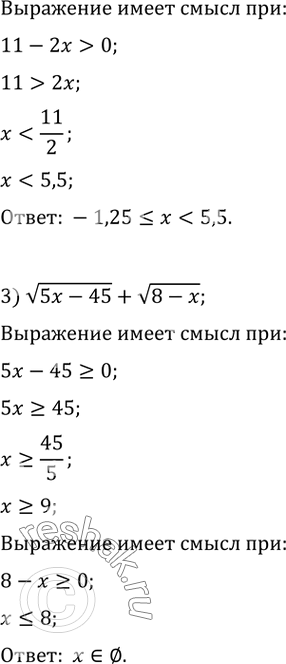 52. При каких значениях переменной имеет смысл выражение: 1) v(3x-10)+v(4x-11); 2) v(4x+5)-1/v(11-2x); 3) v(5x-45)+v(8-x);