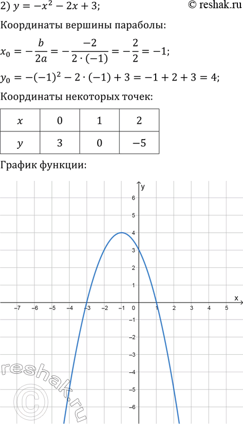 Постройте график функции: 1) y=x^2+4x+3; 2) y=-x^2-2x+3; 3) y= 1/2 x^2-2x-4; 4) y=-2x^2-4x-2; 5) y=3x-x^2; 6) y=1-x^2; 7) y=-0,1x^2+0,4x-0,4; 8) y=x^2-4x+5;