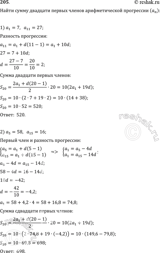 Найдите сумму двадцати первых членов арифметической прогрессии (an), если: 1) a1=79, a11=27; 2) a5=58, a15=16;