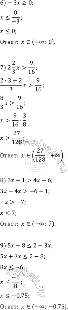 24. Решите неравенство: 1) 2x>-6; 2) -5x3) -2/3 x>-4; 4) -0,2x5) 8,7x>=0; 6) -3x>=0; 7) 2 2/3 x>9/16; 8) 3x+1>4x-6; 9) 5x+8>=2-3x;