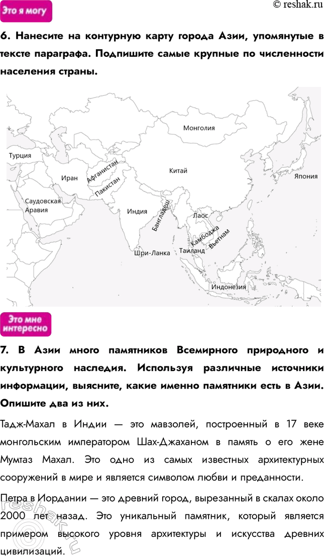 6. Нанесите на контурную карту города Азии, упомянутые в тексте параграфа. Подпишите самые крупные по численности населения страны.