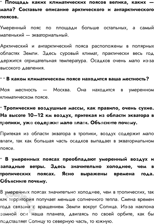 § 6. Климатические пояса Земли 1. Почему воздушные массы перемещаются то к северу, то к югу? Воздушные массы перемещаются то к северу, то к югу, потому что меняется поступление тепла на территорию, что влечет изменение давления.
