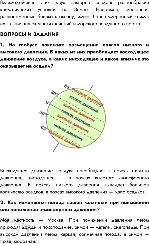1. На глобусе покажите размещение поясов низкого и высокого давления. В каких из них преобладает восходящее движение воздуха, в каких нисходящее и какое влияние это оказывает на осадки?