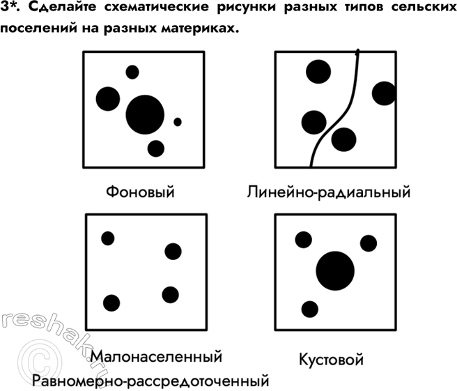 3*. Сделайте схематические рисунки разных типов сельских поселений на разных материках.