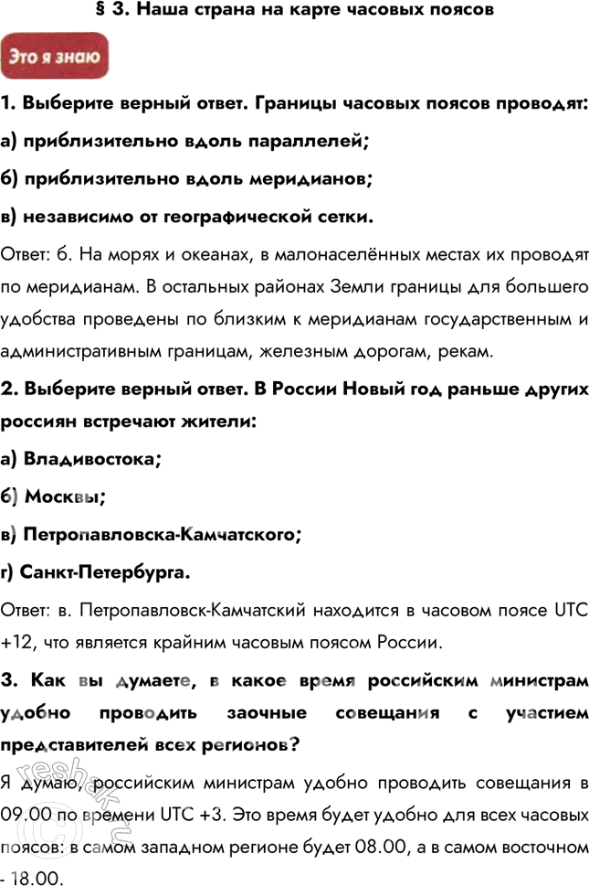 § 3. Наша страна на карте часовых поясов 1. Выберите верный ответ. Границы часовых поясов проводят: а) приблизительно вдоль параллелей; б) приблизительно вдоль меридианов;
