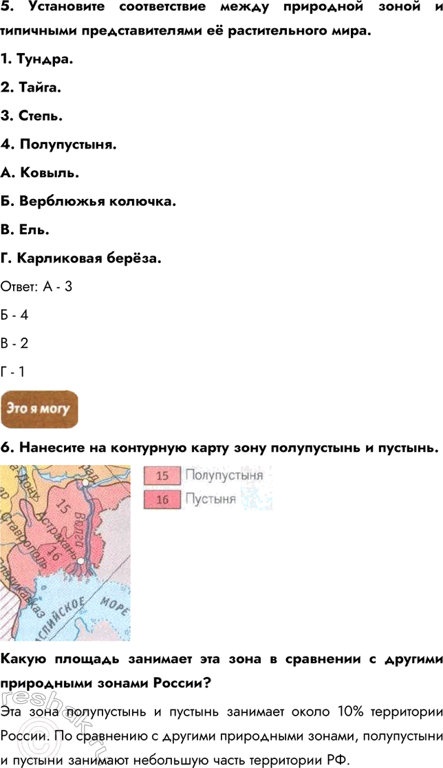 § 35. Южные безлесные зоны 1. Выберите признаки, которые характеризуют зону полупустынь и пустынь: a) подзолистые почвы; б) растения дуб, ясень, каштан;