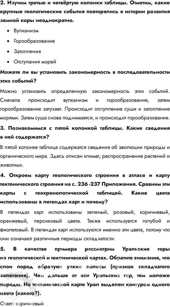 2. Изучим третью и четвёртую колонки таблицы. Отметим, какие крупные геологические события повторялись в истории развития земной коры неоднократно.