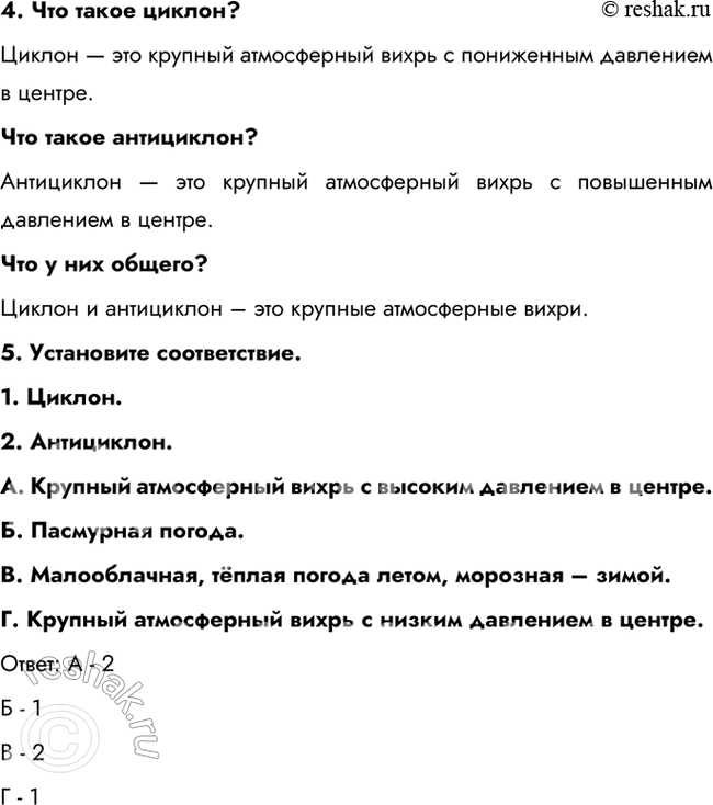 Ответ: б, в. Когда тёплый воздух наступает на холодный, то, будучи более лёгким, он плавно «всползает» вверх по холодному. Тёплый воздух при этом охлаждается (но не так быстро, как на холодном фронте), и образуются перистые, слоистые и слоисто-дождевые облака. Постепенное перемешивание тёплого и холодного воздуха через некоторое время приводит к потеплению. При прохождении тёплого фронта дожди тоже идут, но не такие сильные (чаще моросящие), а движение таких фронтов более медленное. Узнать о приближении тёплого фронта можно по понижению атмосферного давления и появлению перистых облаков.