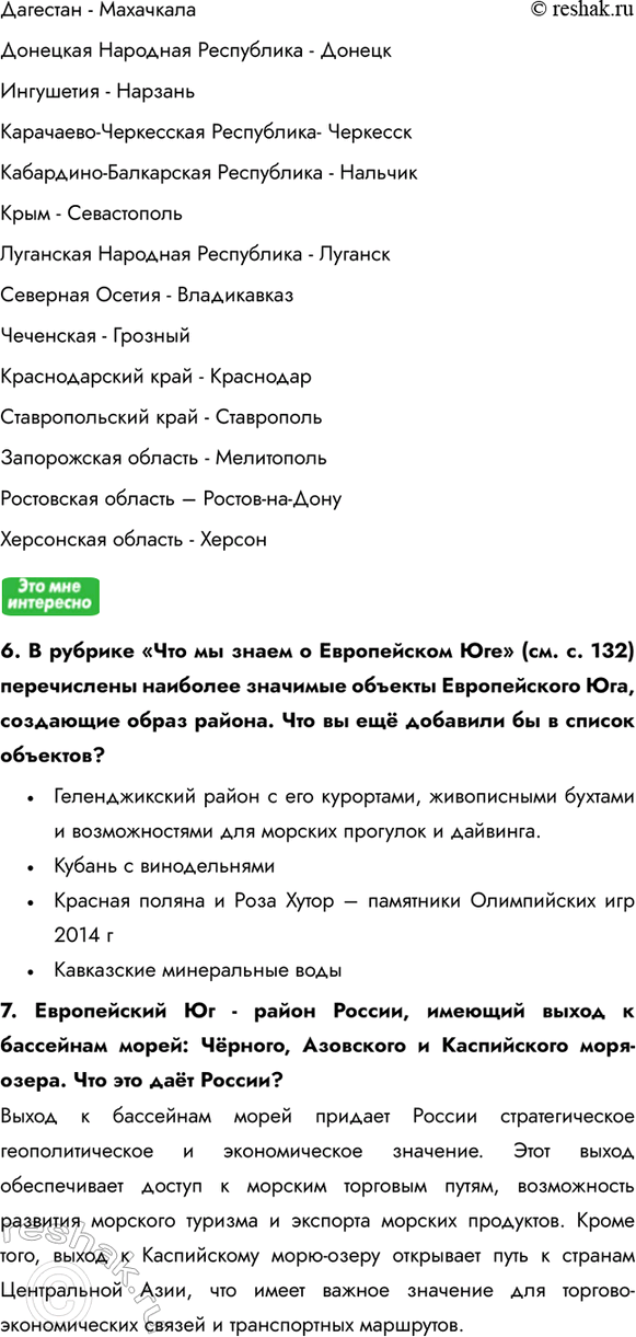 7. Европейский Юг - район России, имеющий выход к бассейнам морей: Чёрного, Азовского и Каспийского моря-озера. Что это даёт России?