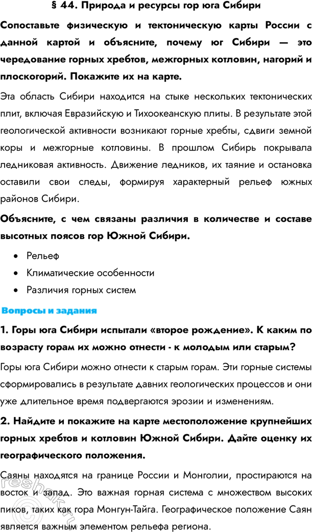 § 44. Природа и ресурсы гор юга Сибири Сопоставьте физическую и тектоническую карты России с данной картой и объясните, почему юг Сибири — это чередование горных хребтов, межгорных котловин, нагорий и плоскогорий.