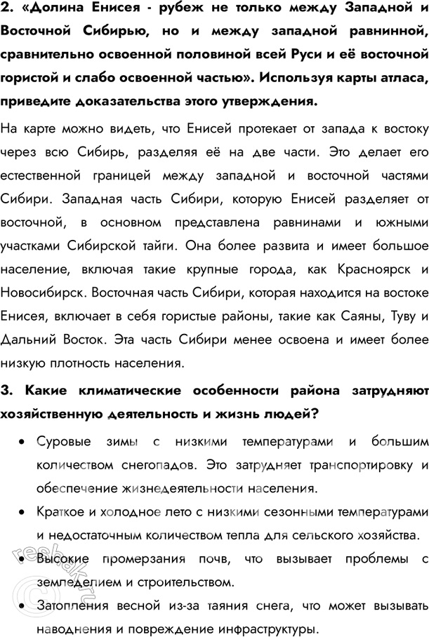 2. «Долина Енисея - рубеж не только между Западной и Восточной Сибирью, но и между западной равнинной, сравнительно освоенной половиной всей Руси и её восточной гористой и слабо освоенной частью». Используя карты атласа, приведите доказательства этого утверждения.
