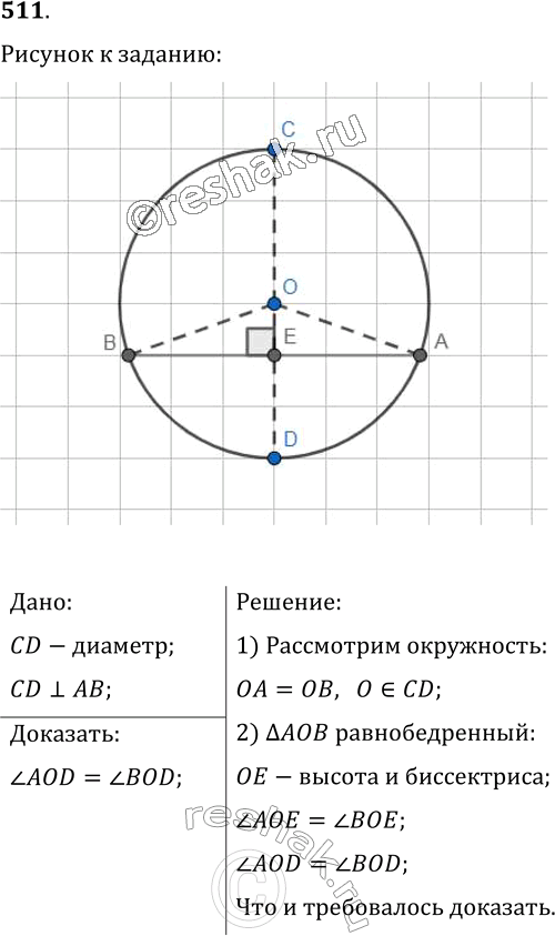 511. На рисунке 296 точка О — центр окружности, диаметр CD перпендикулярен хорде АВ. Докажите, что ?AOD = ?BOD.