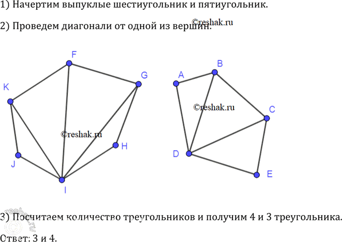 Начертите выпуклые пятиугольник и шестиугольник. В каждом многоугольнике из какой-нибудь вершины проведите все диагонали. На сколько треугольников разделяют проведённые диагонали каждый многоугольник?
