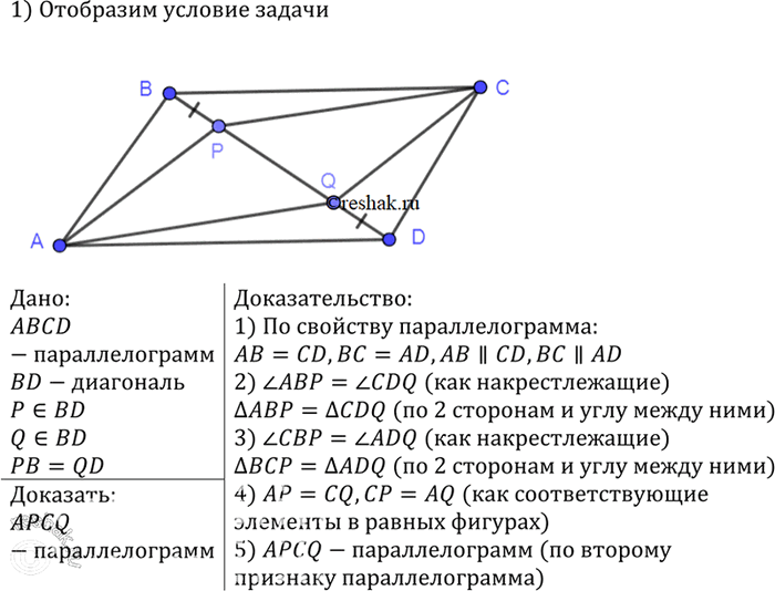 На диагонали BD параллелограмма ABCD отмечены две точки Р и Q так, что РВ = QD. Докажите, что четырёхугольник APCQ — параллелограмм.