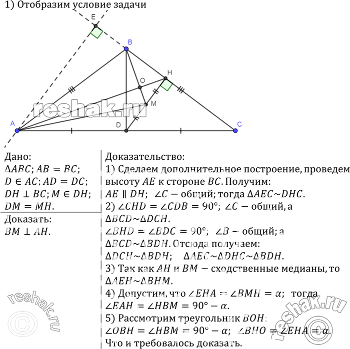 В равнобедренном треугольнике ABC из середины D основания АС проведён перпендикуляр DH к стороне ВС. Пусть М — середина отрезка DH. Докажите, что ВМ перпендикулярен АН.