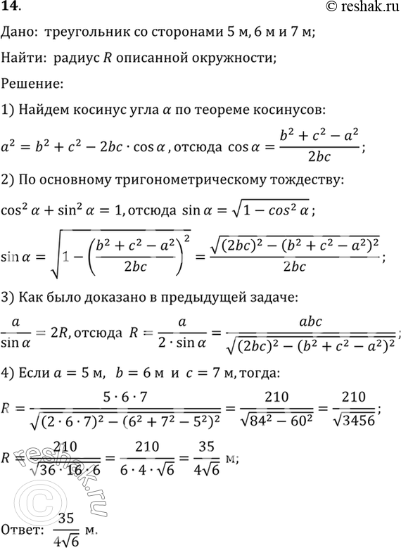 14. Как найти радиус окружности, описанной около треугольника, зная его стороны? Найдите радиус окружности, описанной около треугольника со сторонами 5 м, 6 м, 7 м.