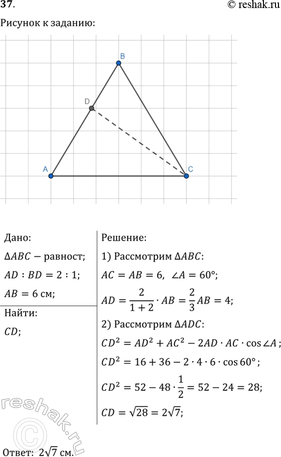 37. На стороне АВ равностороннего треугольника АВС отмечена точка D так, что AD:DB=2:1. Найдите отрезок CD, если АВ=6 см.