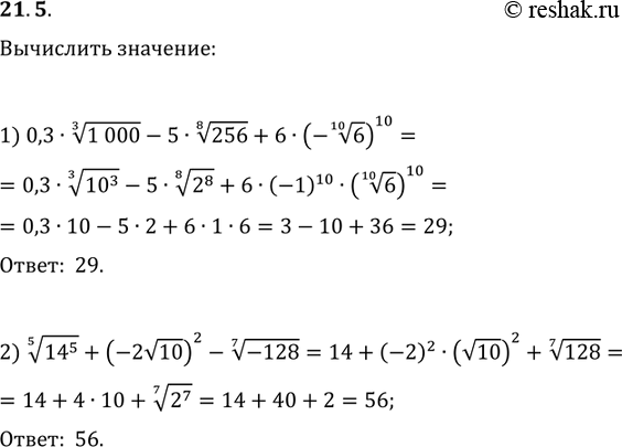 21.5. Вычислите: 1) 0,3(1000^(1/3))-5(256^(1/8))+6·(-6^(1/10))^10; 2) (14^5)^(1/5)+(-2v10)^2-(-128)^(1/7).