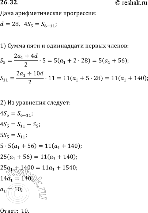 26.32. Разность арифметической прогрессии равна 28, а сумма пяти первых членов в 4 раза меньше суммы следующих шести членов. Чему равен первый член прогрессии?