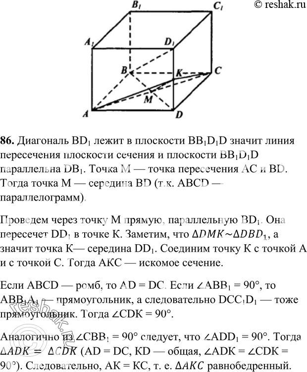 86 Изобразите параллелепипед ABCDA1B1C1D1 и постройте его сечение плоскостью, проходящей через диагональ AC основания параллельно диагонали BD1. Докажите, что если основание параллелепипеда — ромб и углы ABB1 и CBB1 прямые, то построенное сечение — равнобедренный треугольник.
