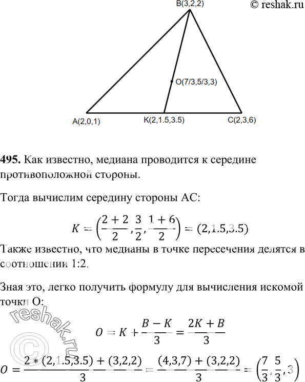 495 Даны точки A (2; 0; 1), B (3; 2; 2) и C (2; 3; 6). Найдите координаты точки пересечения медиан треугольника ABC.