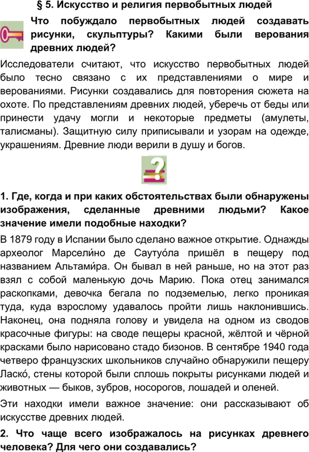 § 5. Искусство и религия первобытных людей Что побуждало первобытных людей создавать рисунки, скульптуры? Какими были верования древних людей? Исследователи считают, что искусство первобытных людей было тесно связано с их представлениями о мире и верованиями.