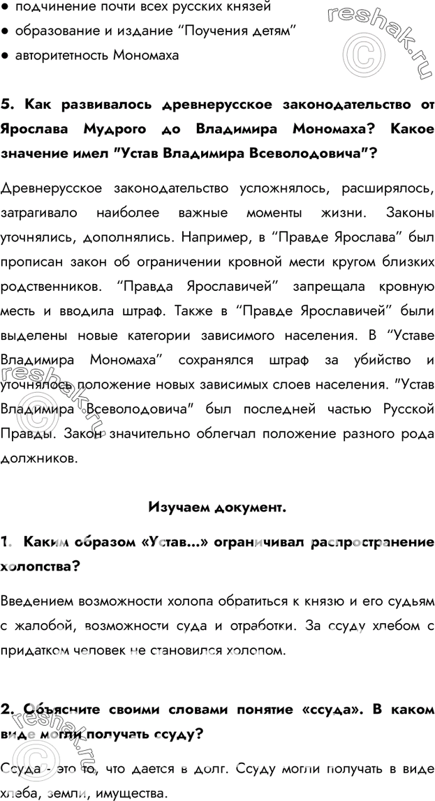 5. Как развивалось древнерусское законодательство от Ярослава Мудрого до Владимира Мономаха? Какое значение имел "Устав Владимира Всеволодовича"?
