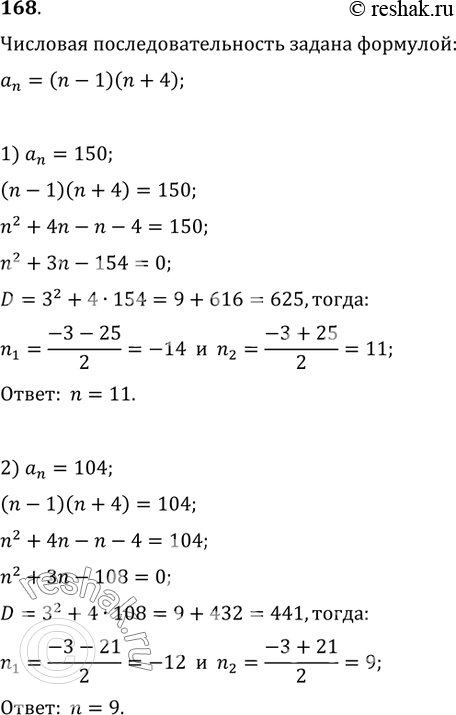 168. Числовая последовательность задана формулой n-го члена a_n=(n-1)(n+4). Найти n, если: 1) a_n=150; 2) a_n=104.