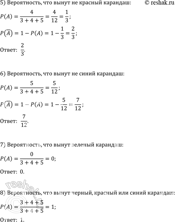 314. В коробке находятся 3 чёрных, 4 красных и 5 синих карандашей. Наугад вынимается один карандаш. Найти вероятность того, что вынутый карандаш: 1) чёрный; 2) красный; 3) синий; 4) не чёрный; 5) не красный; 6) не синий; 7) зелёный; 8) или чёрный, или красный, или синий.