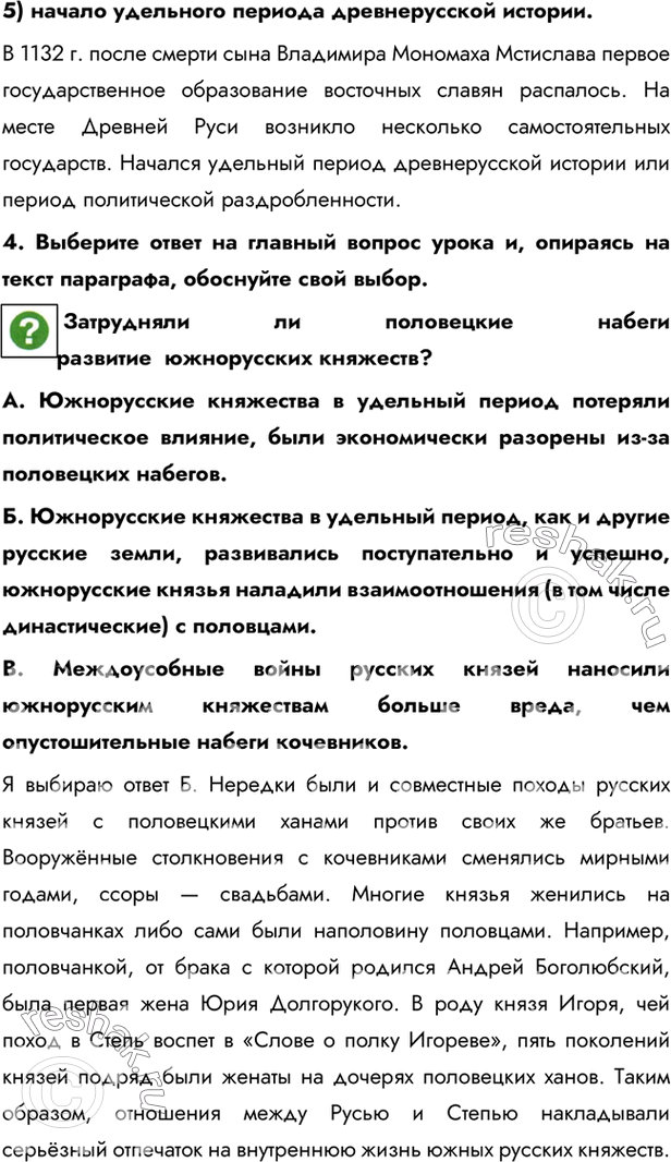 Я выбираю ответ Б. Нередки были и совместные походы русских князей с половецкими ханами против своих же братьев. Вооружённые столкновения с кочевниками сменялись мирными годами, ссоры — свадьбами. Многие князья женились на половчанках либо сами были наполовину половцами. Например, половчанкой, от брака с которой родился Андрей Боголюбский, была первая жена Юрия Долгорукого. В роду князя Игоря, чей поход в Степь воспет в «Слове о полку Игореве», пять поколений князей подряд были женаты на дочерях половецких ханов. Таким образом, отношения между Русью и Степью накладывали серьёзный отпечаток на внутреннюю жизнь южных русских княжеств.