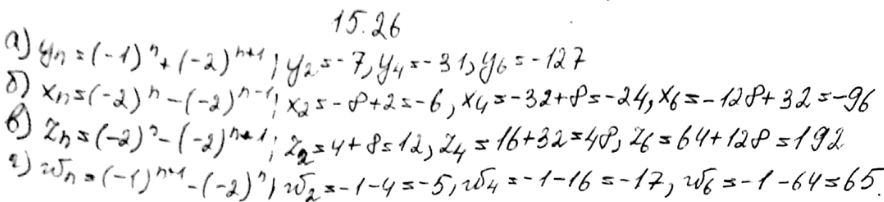 15.26. Последовательность задана формулой n-го члена. Вычислите ее первые три члена с четными номерами: а) yn=(-1)n+(-2)n+1; б) xn=(-2)n+1 - (-2)n-1; в) zn=(-2)n - (-2)n+1;