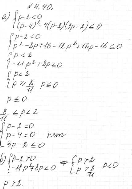 4.40. При каких значениях параметра р неравенство (р - 2)х2 - (р - 4)х + (3р - 2) > 0: а) не имеет решений;