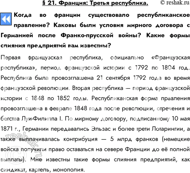 Когда во франции существовало республиканское правление? Каковы были условия мирного договора с Германией после Франко-прусской войны? Какие формы слияния предприятий вам известны?