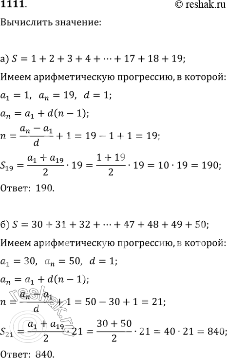 1111. Вычислите: а) 1+2+3+4+...+17+18+19; б) 30+31+32+...+47+48+49+50.