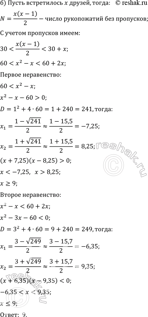 б) Встретились несколько друзей, каждый пожал руку каждому. Последним пришёл Петя Угрюмов, он пожал руку не всем своим друзьям. Всего было 30 рукопожатий. Сколько друзей встретилось?