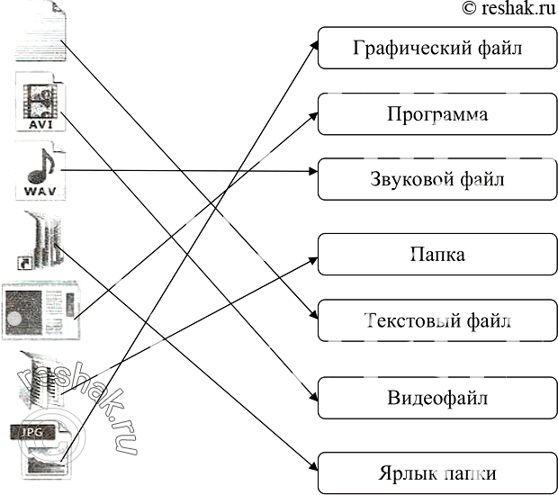16. Установите соответствие между значками и обозначаемыми ими компьютерными объектами. Графический файл Программа Звуковой файл Папка Текстовый файл Видеофайл Ярлык